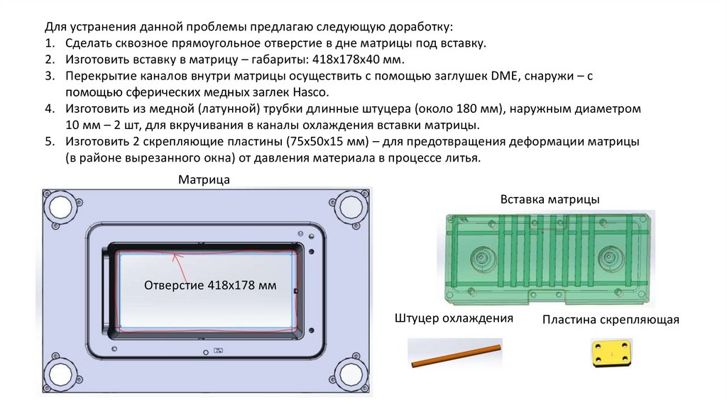 Для устранения данной проблемы предлагаю следующую доработку:1. Сделать сквозное прямоугольное отверстие в дне матрицы под вставку.