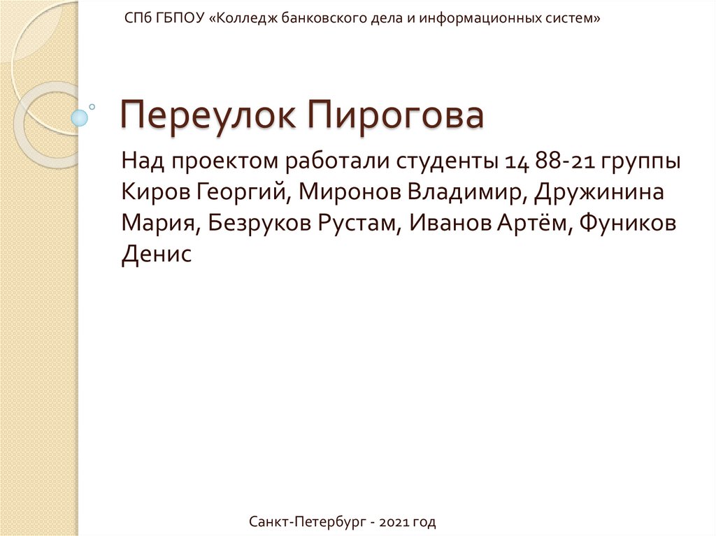 СПб ГБПОУ «Колледж банковского дела и информационных систем»Переулок Пирогова