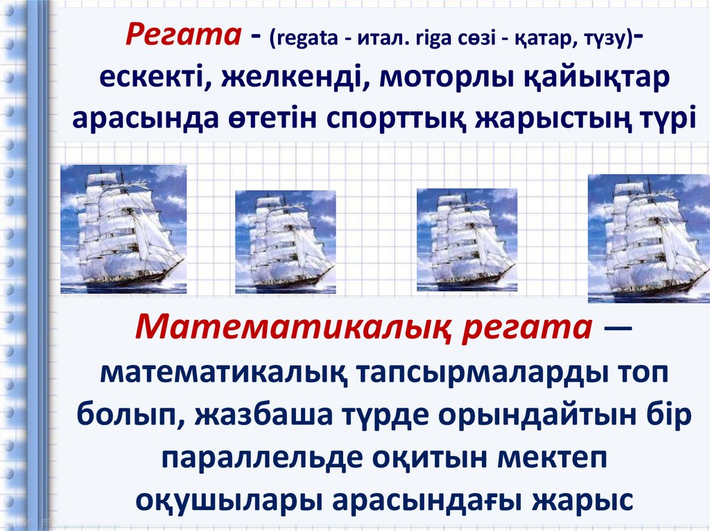 Математикалық регата ережесі1. Математикалық регата – топтық жарыс. Әр топтың 4 мүшесі