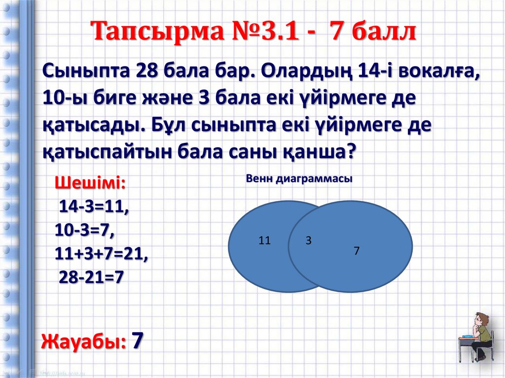 Тапсырма №3.1 - 7 баллСыныпта 28 бала бар. Олардың 14-і вокалға,