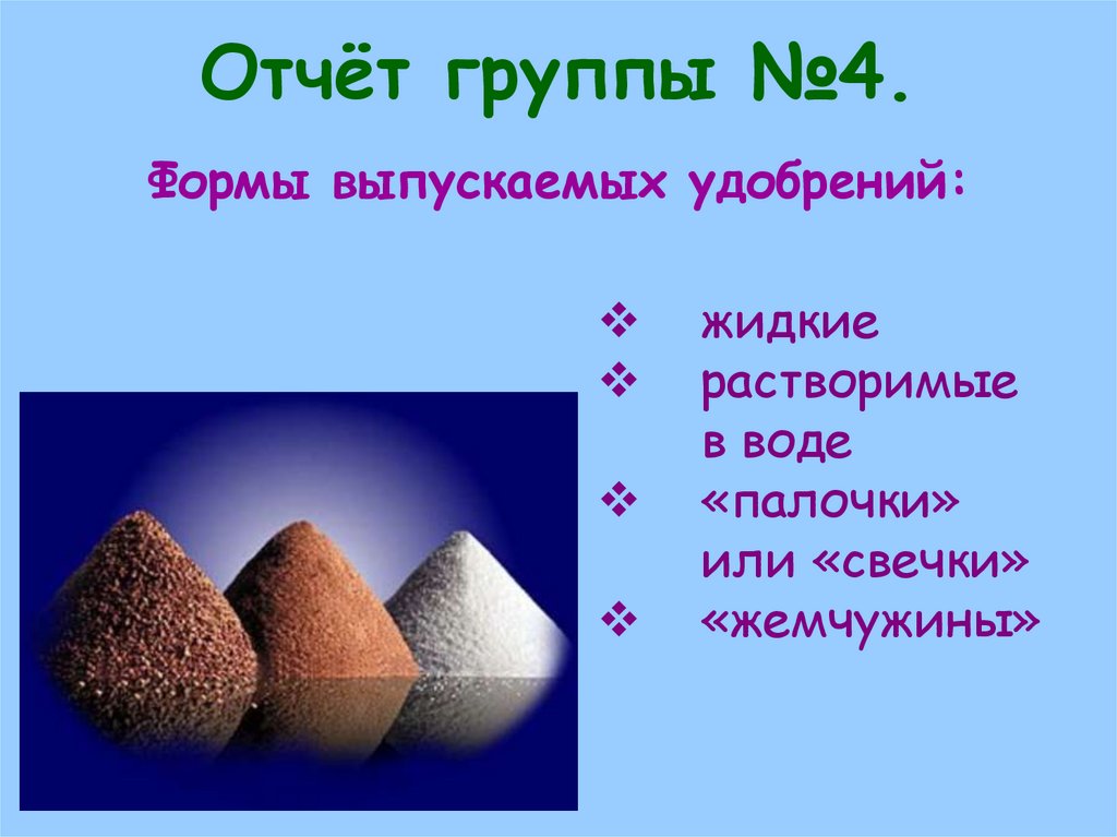 Отчёт группы №4.Формы выпускаемых удобрений: