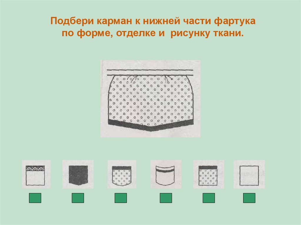Подбери карман к нижней части фартукапо форме, отделке и рисунку ткани.
