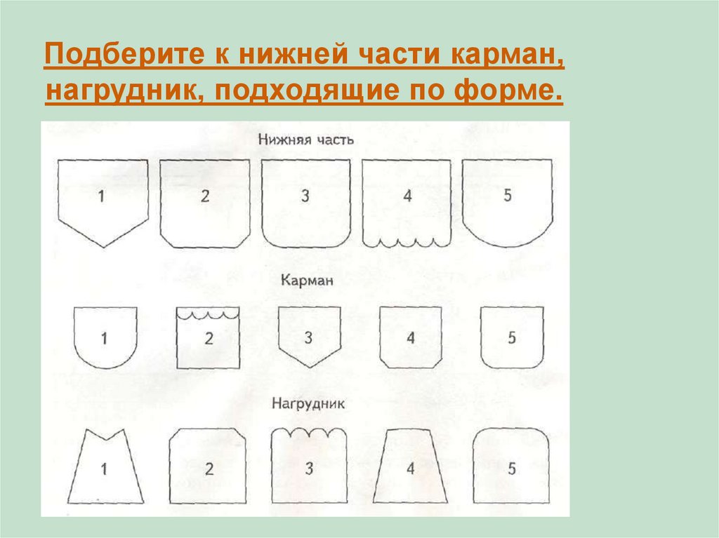 Подберите к нижней части карман,нагрудник, подходящие по форме.