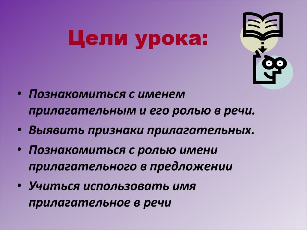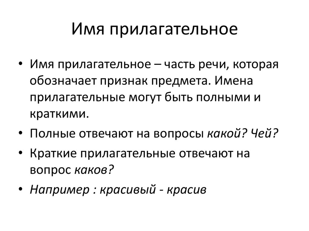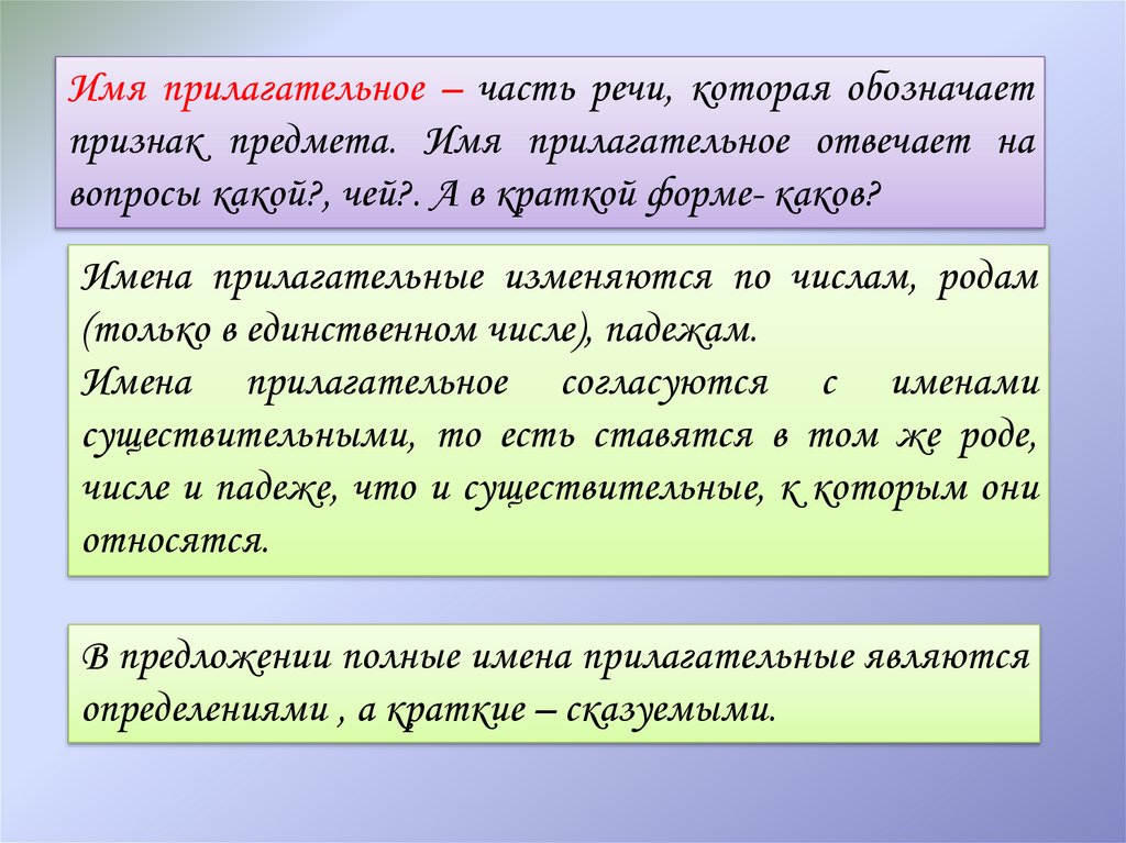 Имя прилагательное – часть речи, которая обозначаетпризнак предмета. Имя прилагательное отвечает на