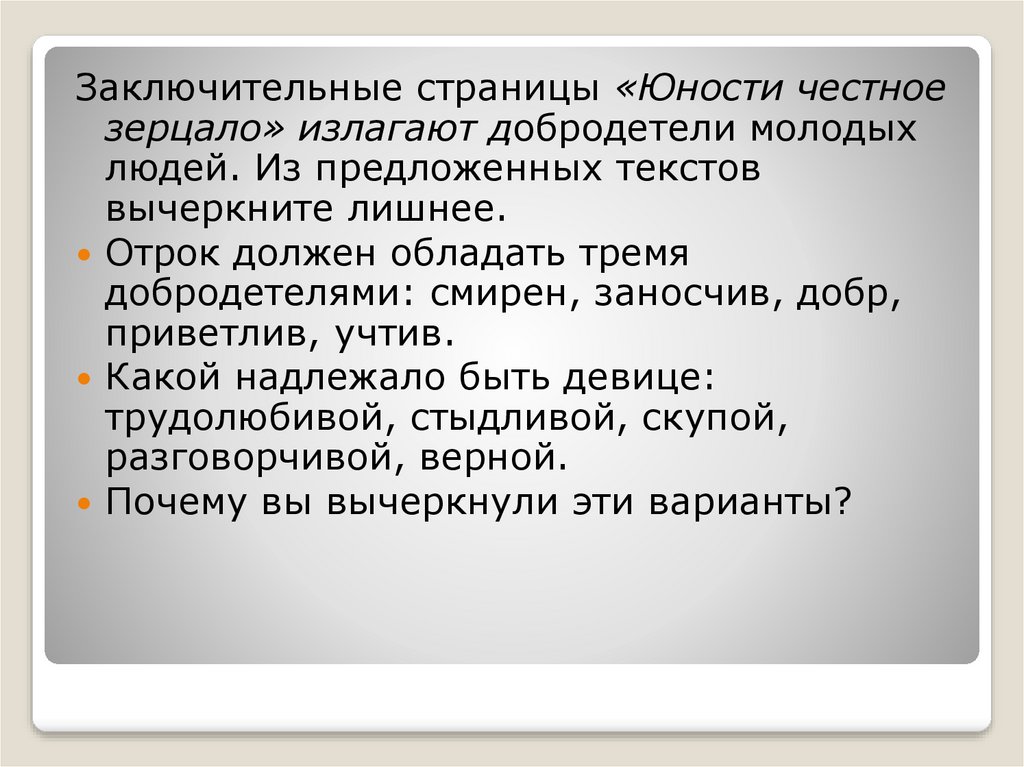 Заключительные страницы «Юности честноезерцало» излагают добродетели молодых