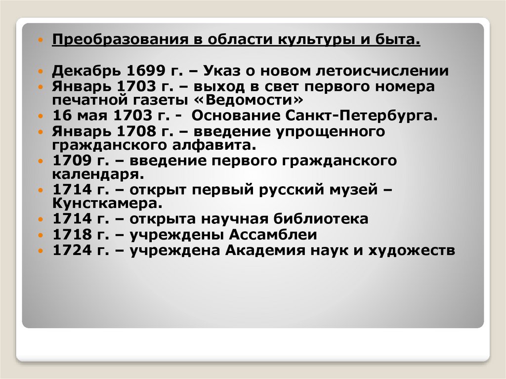 Преобразования в области культуры и быта.Декабрь 1699 г. – Указ о новом летоисчислении
