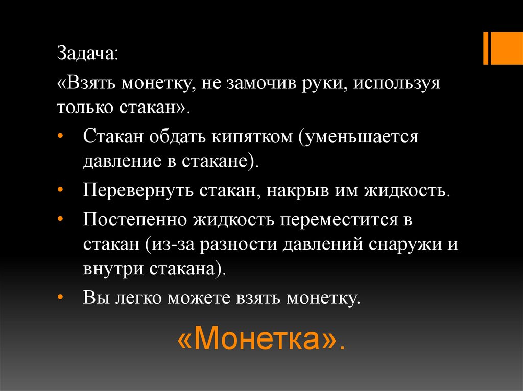 Задача:«Взять монетку, не замочив руки, используя
