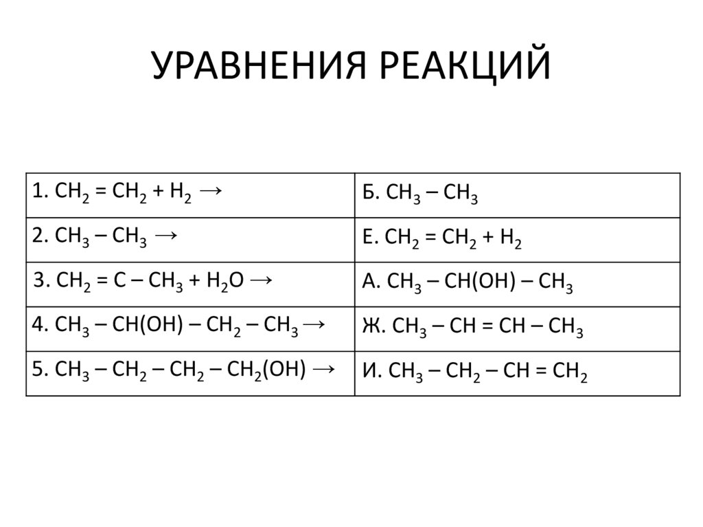 УРАВНЕНИЯ РЕАКЦИЙ1. СН2 = СН2 + Н2 →