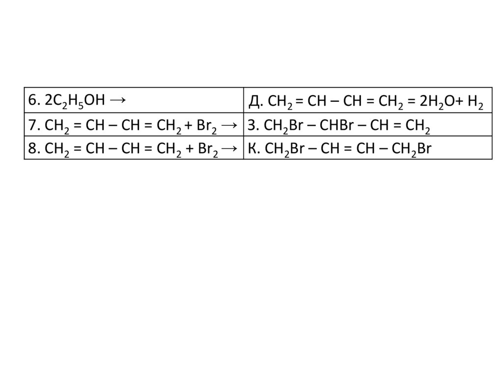 6. 2С2Н5ОН →Д. СН2 = СН – СН = СН2 = 2Н2О+ Н2