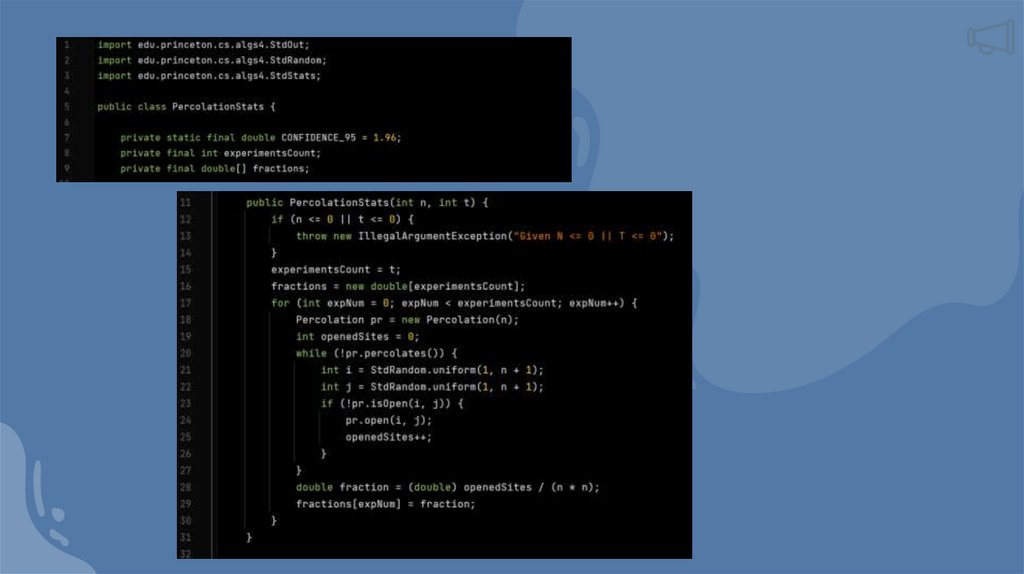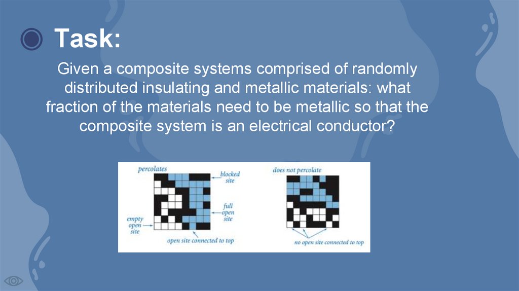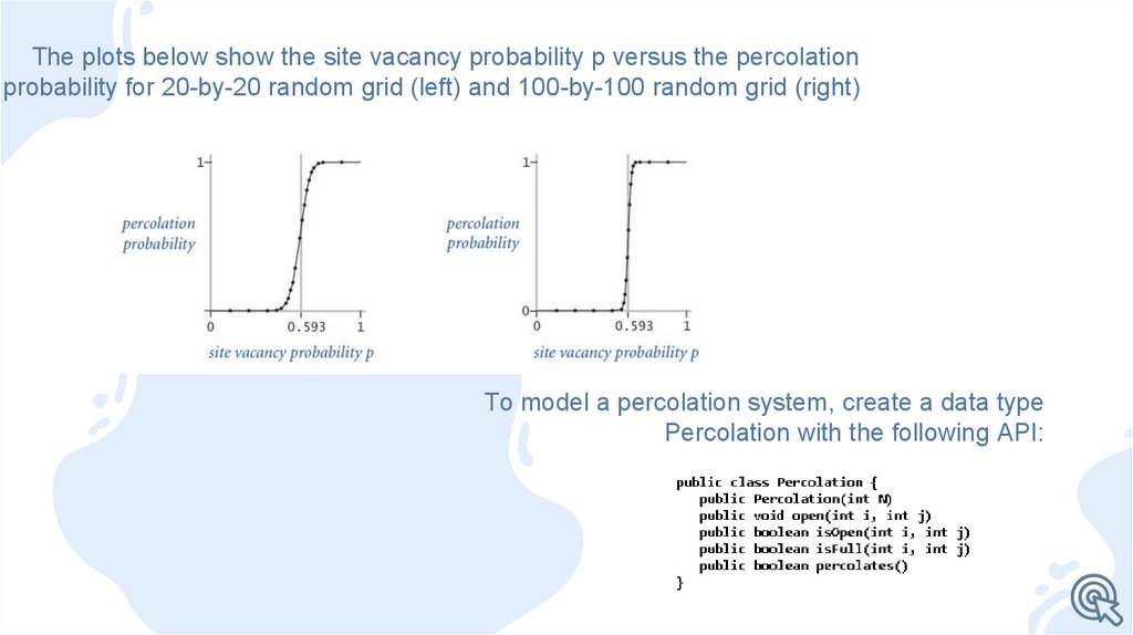 The plots below show the site vacancy probability p versus the percolationprobability for 20-by-20 random grid (left) and 100-by-100 random grid (right)