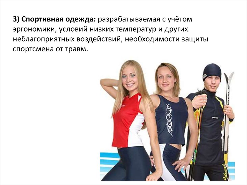 3) Спортивная одежда: разрабатываемая с учётомэргономики, условий низких температур и других