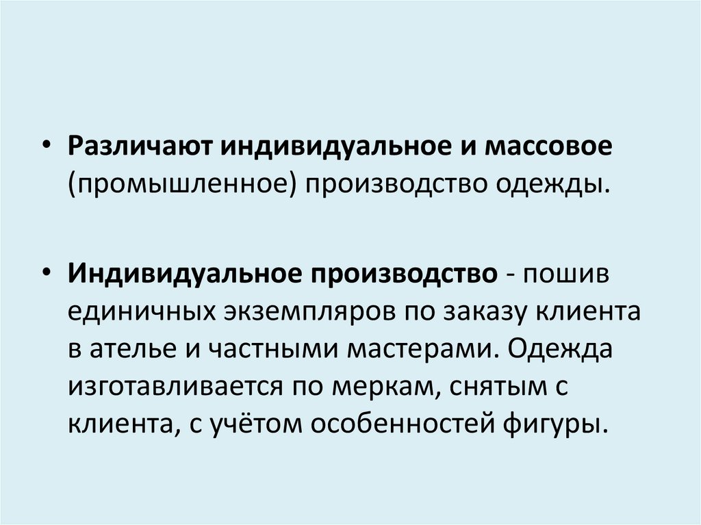 • Различают индивидуальное и массовое(промышленное) производство одежды.
