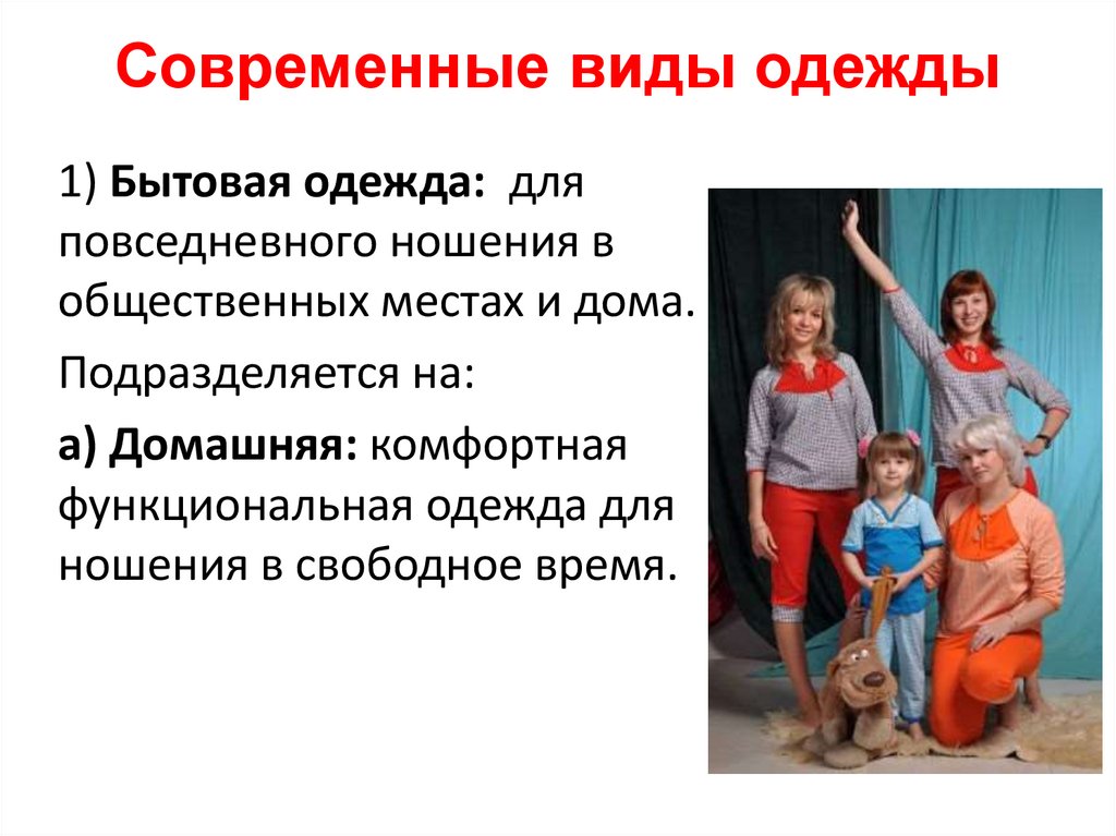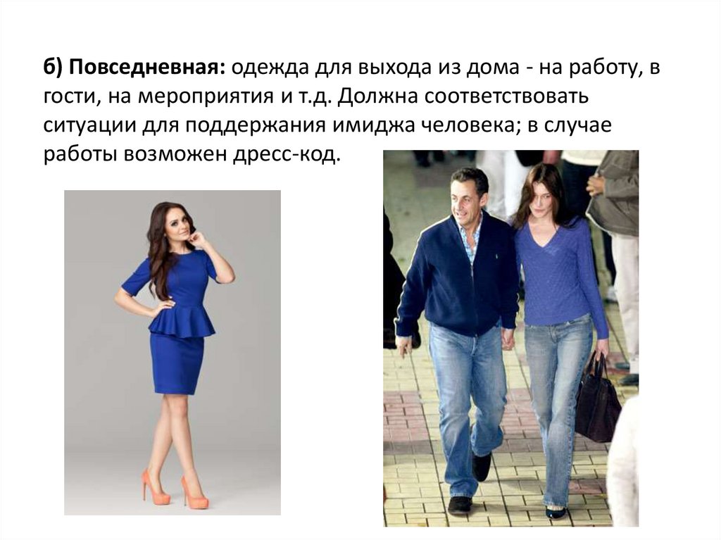 б) Повседневная: одежда для выхода из дома - на работу, вгости, на мероприятия и т.д. Должна соответствовать