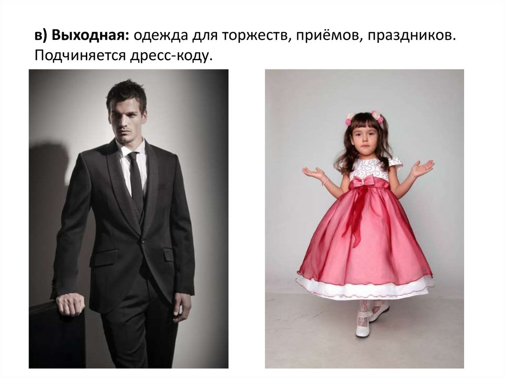 в) Выходная: одежда для торжеств, приёмов, праздников.Подчиняется дресс-коду.