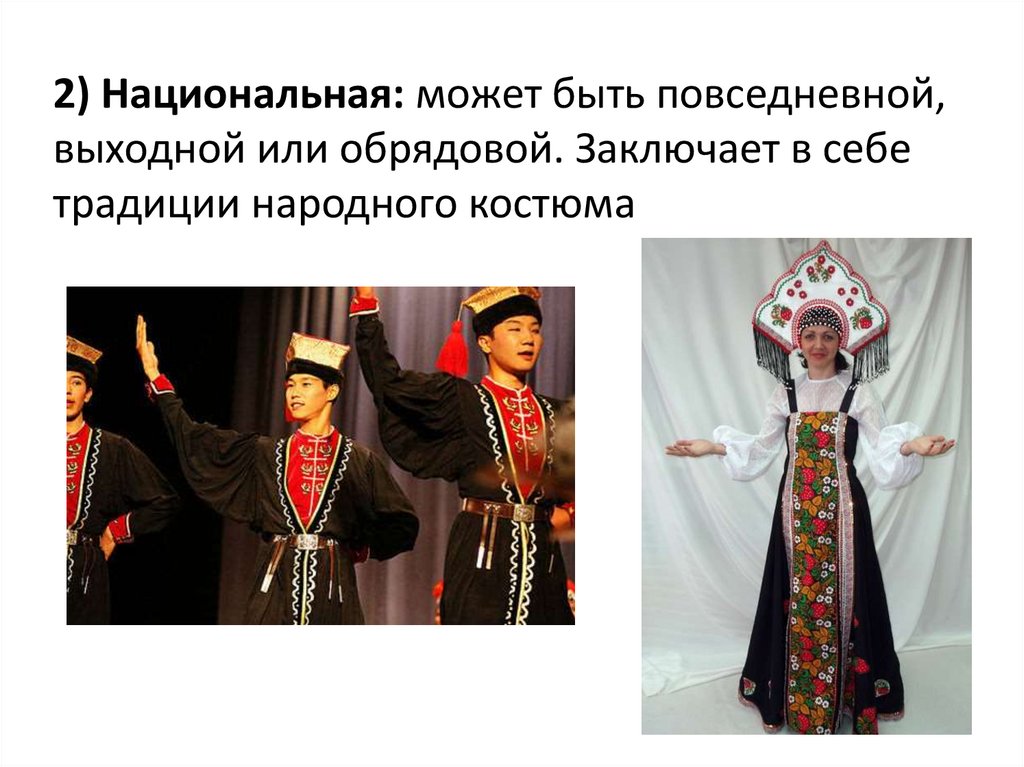 2) Национальная: может быть повседневной,выходной или обрядовой. Заключает в себе