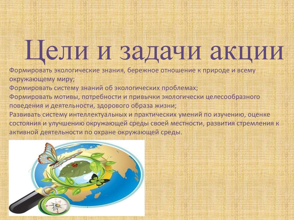 Цели и задачи акцииФормировать экологические знания, бережное отношение к природе и всему