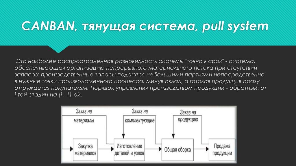 CANBAN, тянущая система, pull systemЭто наиболее распространенная разновидность системы "точно в срок" - система,