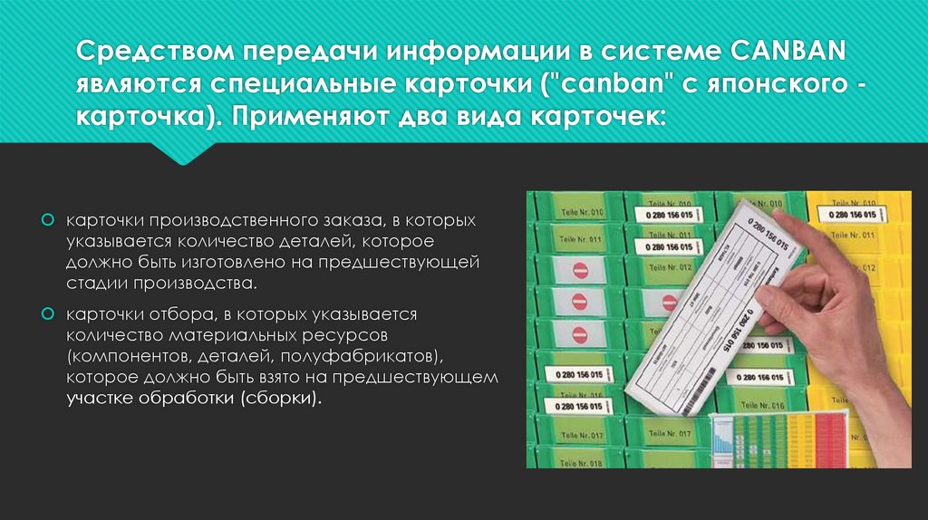 Средством передачи информации в системе CANBANявляются специальные карточки ("canban" с японского карточка). Применяют два вида карточек: