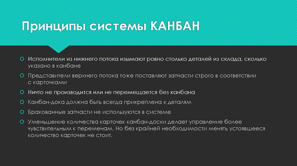 Принципы системы КАНБАНИсполнители из нижнего потока изымают ровно столько деталей из склада, сколько