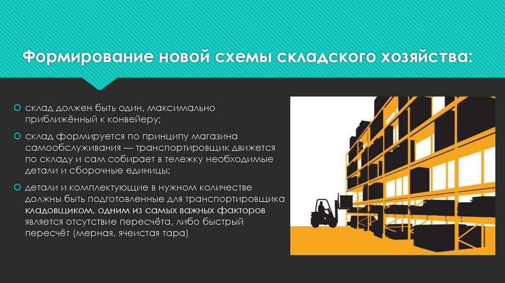 Формирование новой схемы складского хозяйства:склад должен быть один, максимально