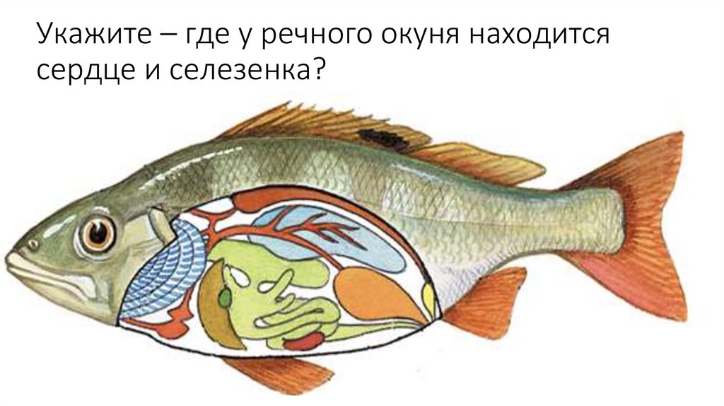 Укажите – где у речного окуня находитсясердце и селезенка?