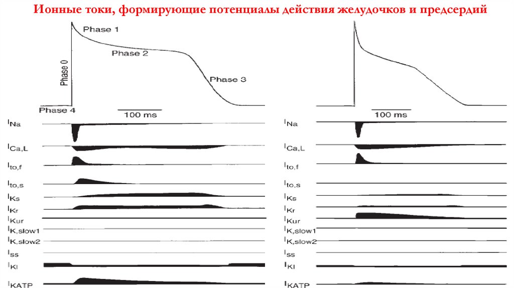 Ионные токи, формирующие потенциалы действия желудочков и предсердий9.