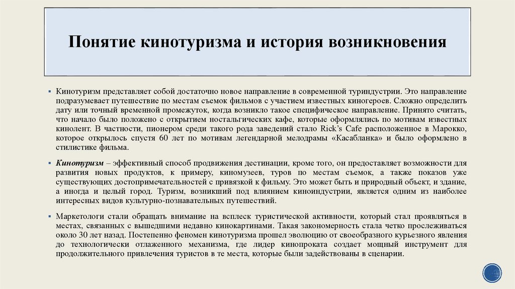 Понятие кинотуризма и история возникновенияКинотуризм представляет собой достаточно новое направление в современной туриндустрии. Это направление