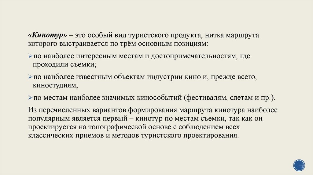 «Кинотур» – это особый вид туристского продукта, нитка маршрутакоторого выстраивается по трём основным позициям:
