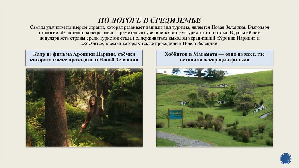 ПО ДОРОГЕ В СРЕДИЗЕМЬЕСамым удачным примером страны, которая развивает данный вид туризма, является Новая Зеландия. Благодаря