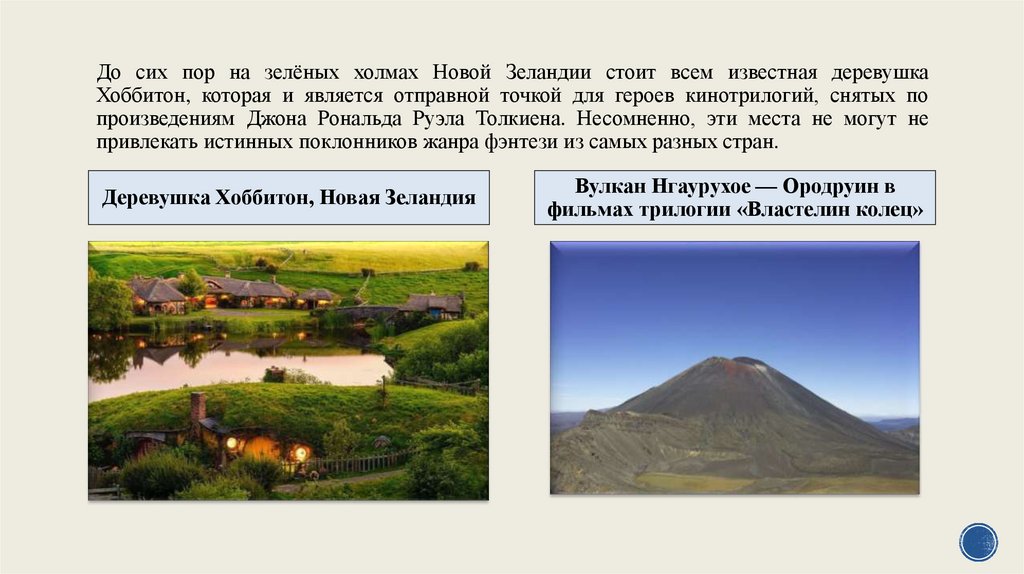 До сих пор на зелёных холмах Новой Зеландии стоит всем известная деревушкаХоббитон, которая и является отправной точкой для героев кинотрилогий, снятых по