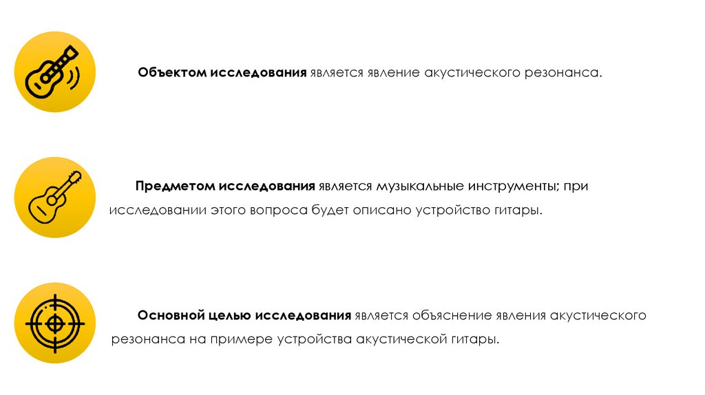 Объектом исследования является явление акустического резонанса.Предметом исследования является музыкальные инструменты; при