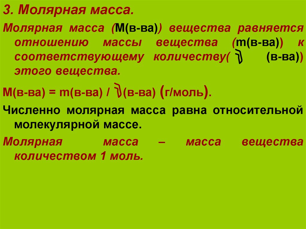 3. Молярная масса.Молярная масса (М(в-ва)) вещества равняется