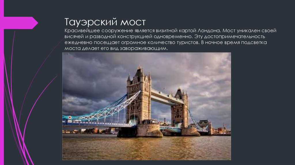 Тауэрский мостКрасивейшее сооружение является визитной картой Лондона. Мост уникален своей