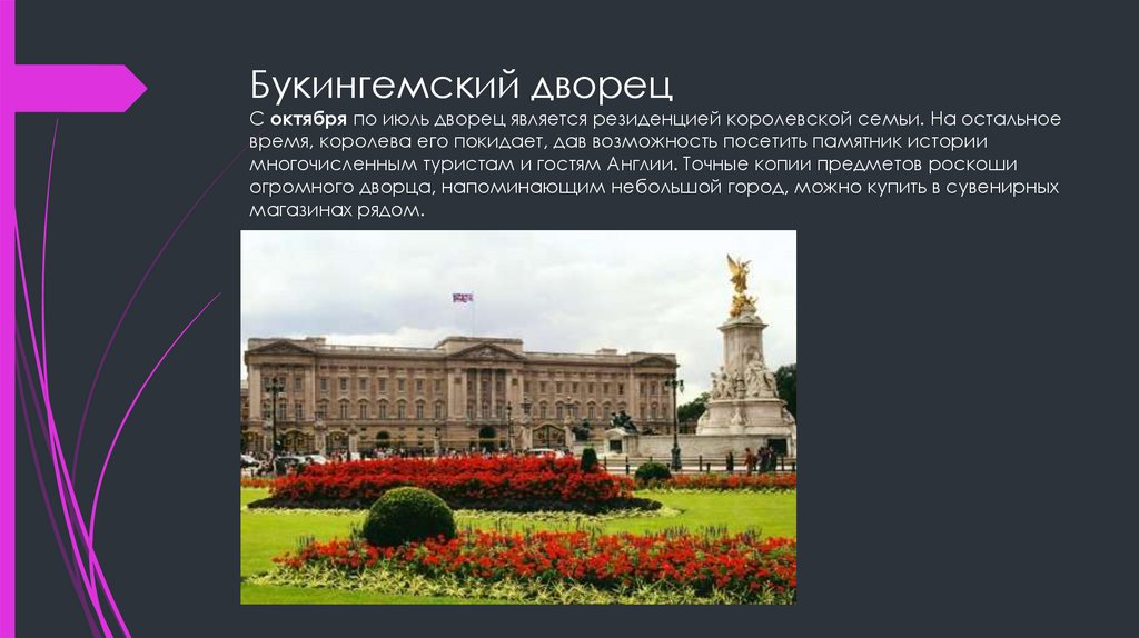 Букингемский дворецС октября по июль дворец является резиденцией королевской семьи. На остальное