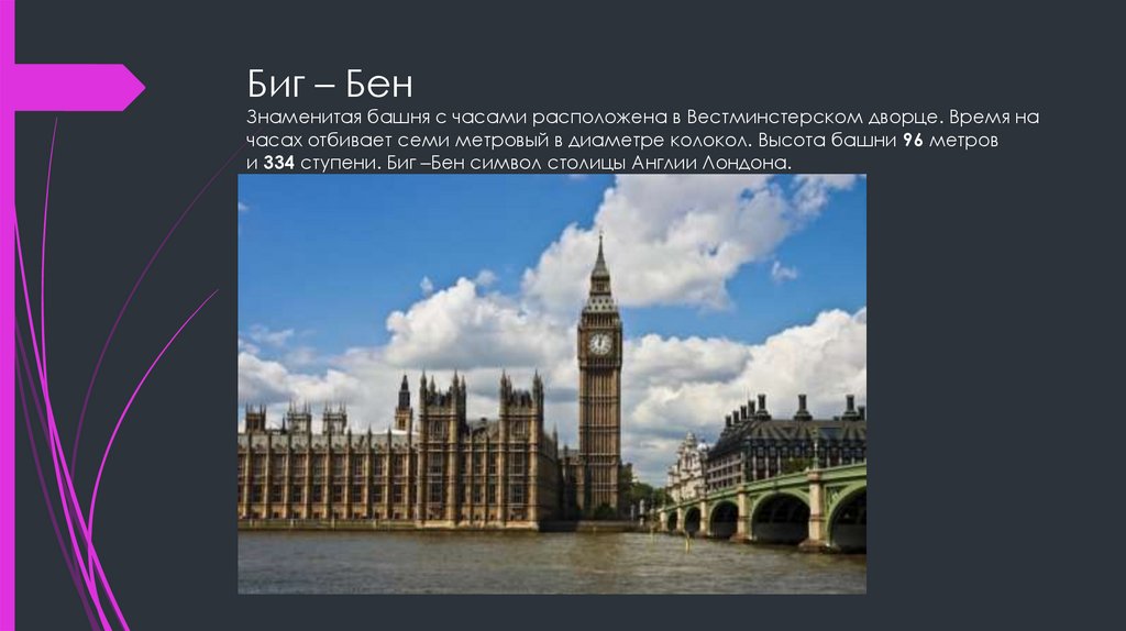 Биг – БенЗнаменитая башня с часами расположена в Вестминстерском дворце. Время на