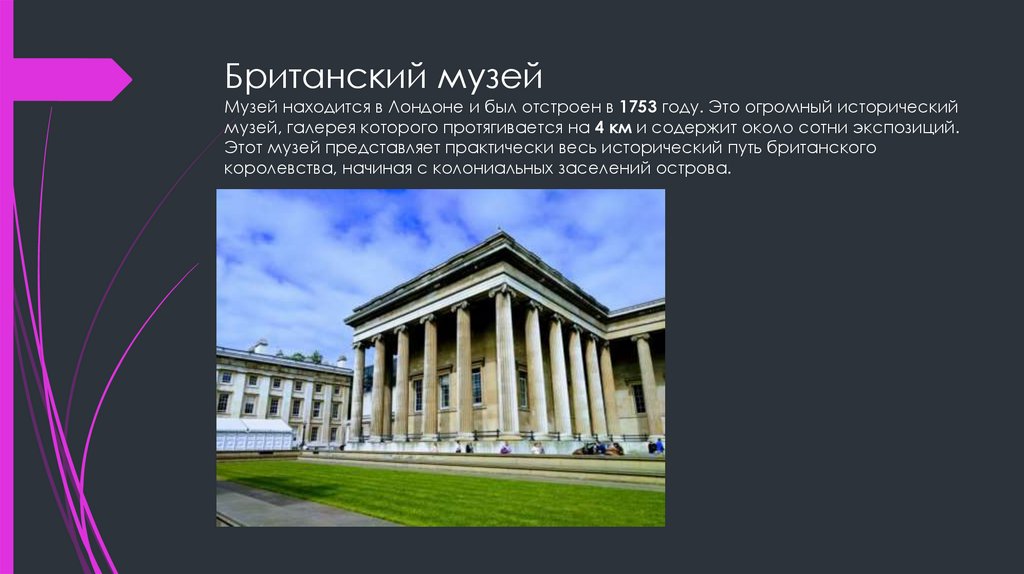 Британский музейМузей находится в Лондоне и был отстроен в 1753 году. Это огромный исторический