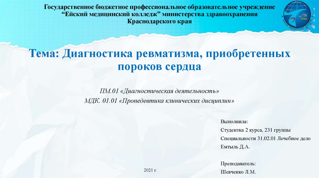 Государственное бюджетное профессиональное образовательное учреждение“Ейский медицинский колледж” министерства здравоохранения