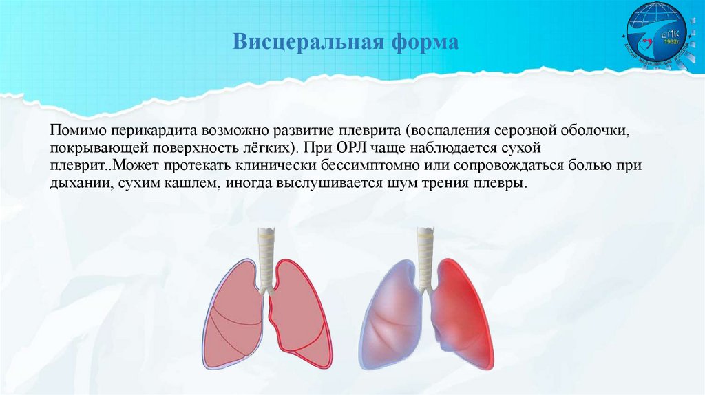 Висцеральная формаПомимо перикардита возможно развитие плеврита (воспаления серозной оболочки,