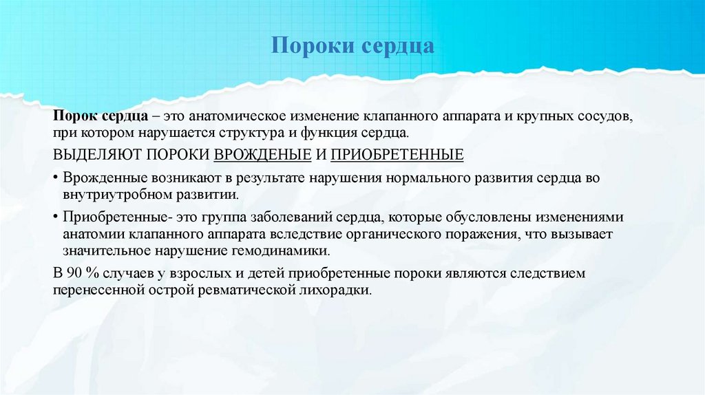 В 90 % случаев у взрослых и детей приобретенные пороки являются следствием
