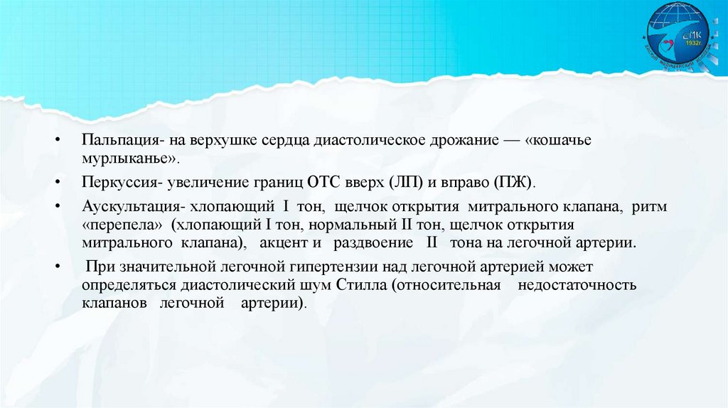 митрального клапана), акцент и раздвоение II тона на легочной артерии.