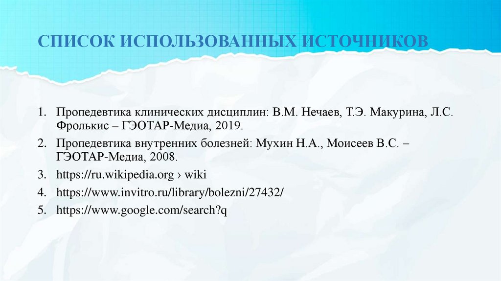 СПИСОК ИСПОЛЬЗОВАННЫХ ИСТОЧНИКОВ1. Пропедевтика клинических дисциплин: В.М. Нечаев, Т.Э. Макурина, Л.С.