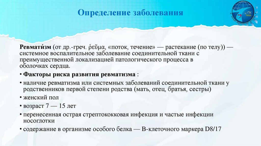 Определение заболеванияРевмати́зм (от др.-греч. ῥεῦμα, «поток, течение» — растекание (по телу)) —