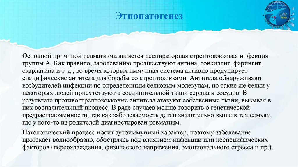 ЭтиопатогенезОсновной причиной ревматизма является респираторная стрептококковая инфекция