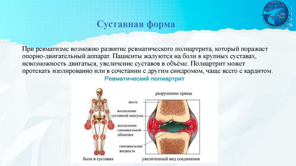 Суставная формаПри ревматизме возможно развитие ревматического полиартрита, который поражает