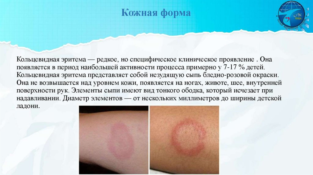 Кожная формаКольцевидная эритема — редкое, но специфическое клиническое проявление . Она