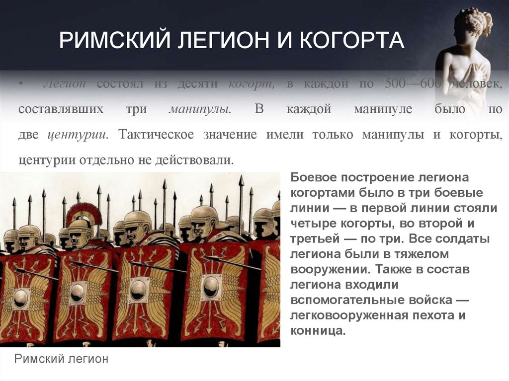 РИМСКИЙ ЛЕГИОН И КОГОРТАЛегион состоял из десяти когорт, в каждой по 500—600 человек,