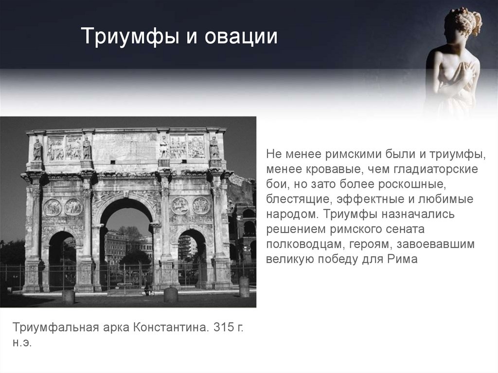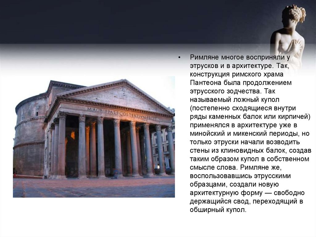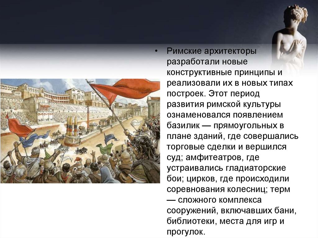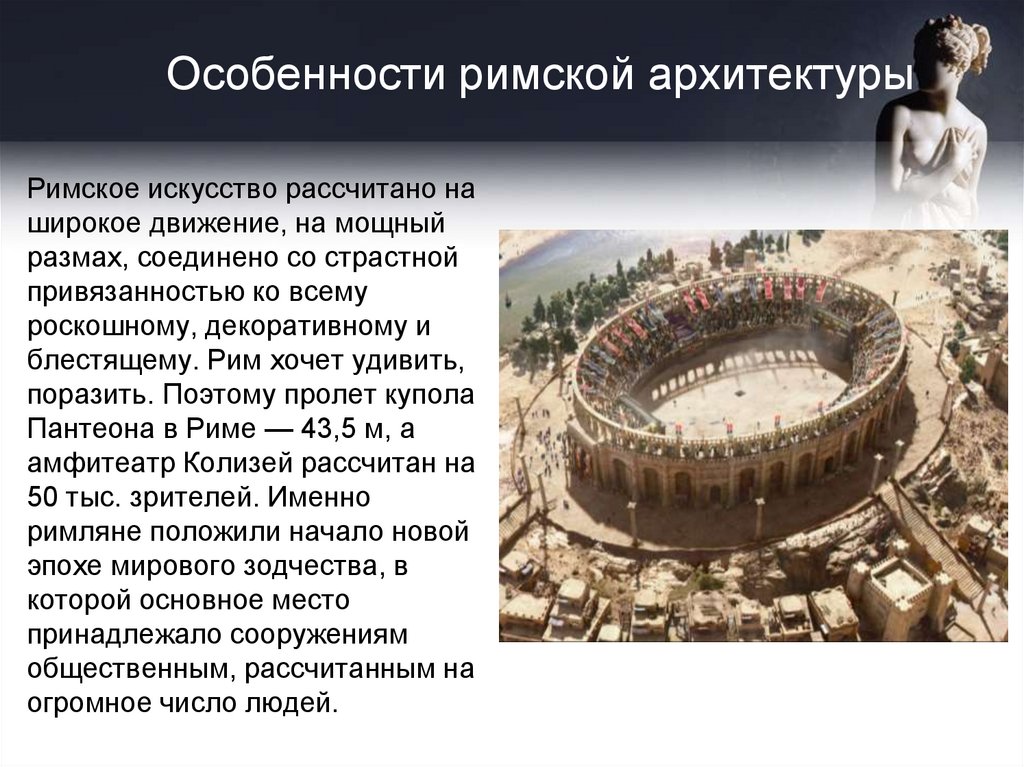 Особенности римской архитектуры• Римское искусство рассчитано на
