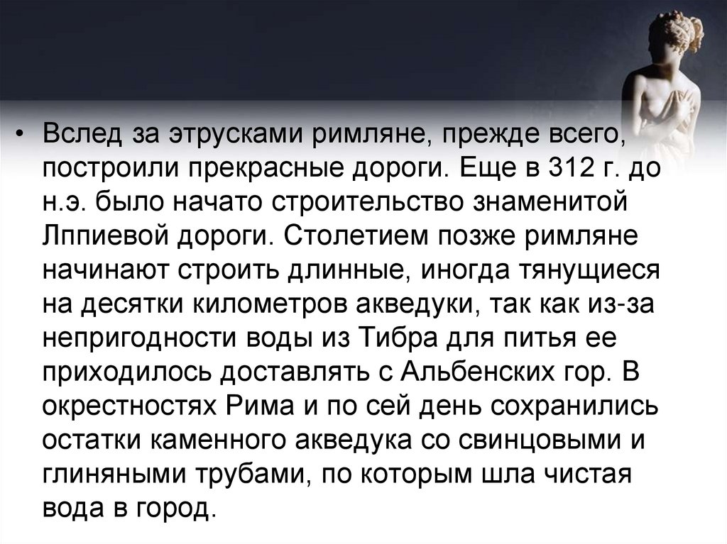 • Вслед за этрусками римляне, прежде всего,построили прекрасные дороги. Еще в 312 г. до