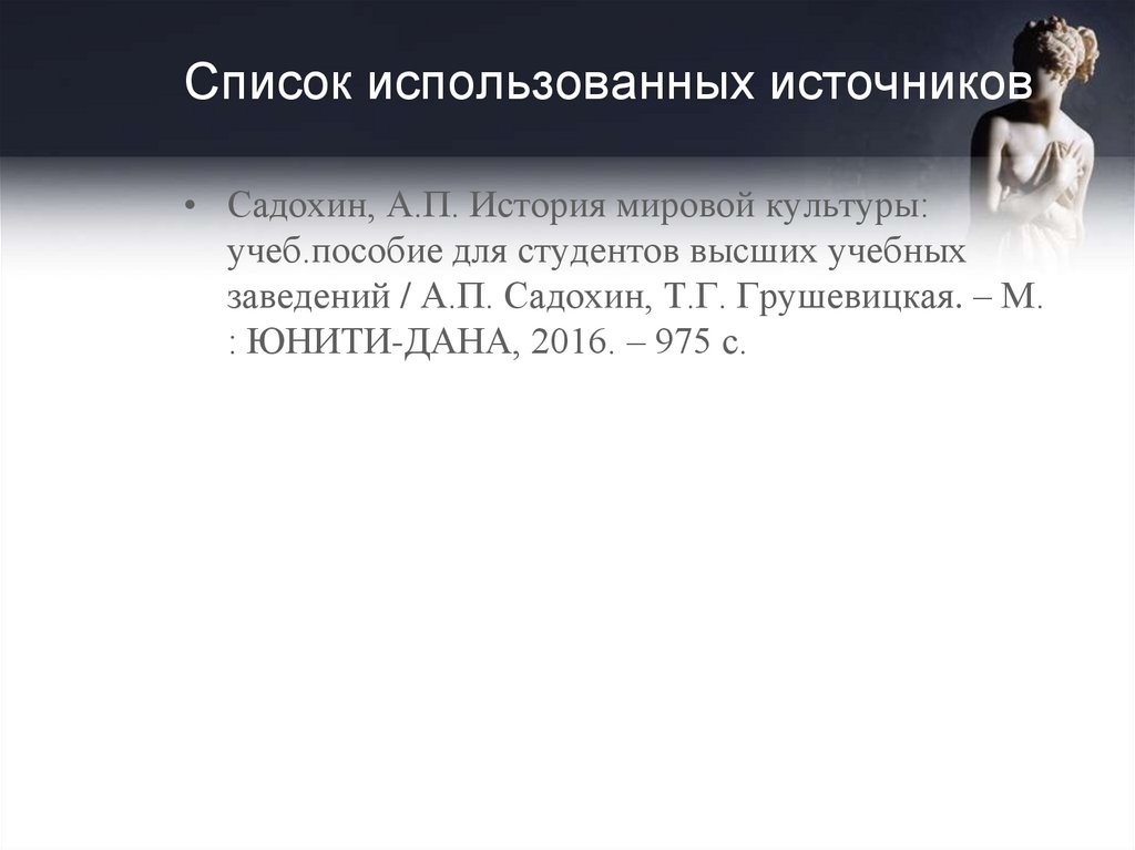 Список использованных источников• Садохин, А.П. История мировой культуры: