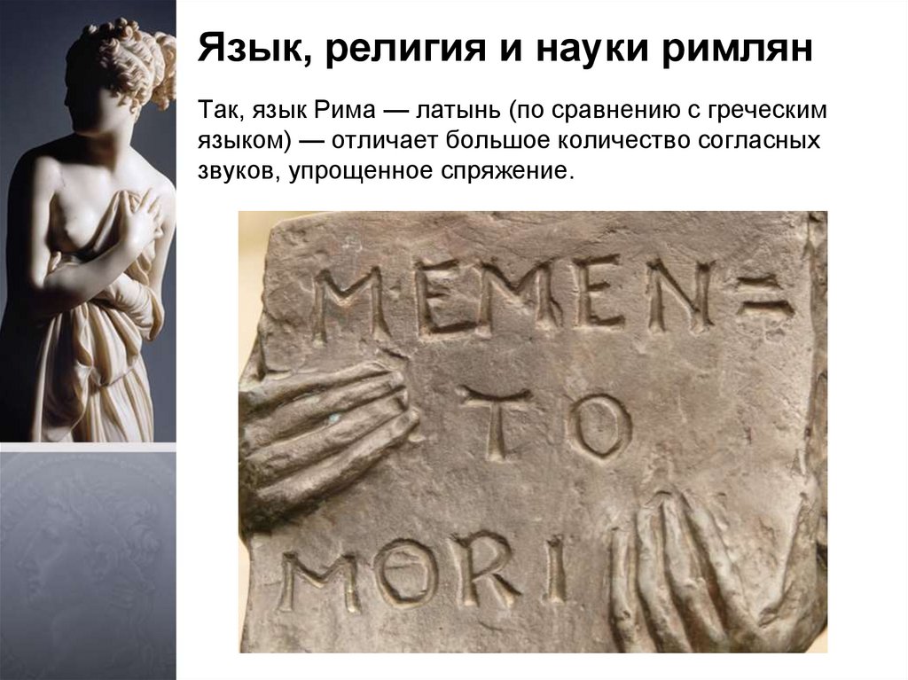 Язык, религия и науки римлянТак, язык Рима — латынь (по сравнению с греческим